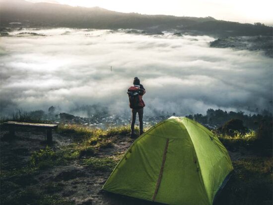 Genieße den Blick auf die Berge und das glitzernde Wasser.